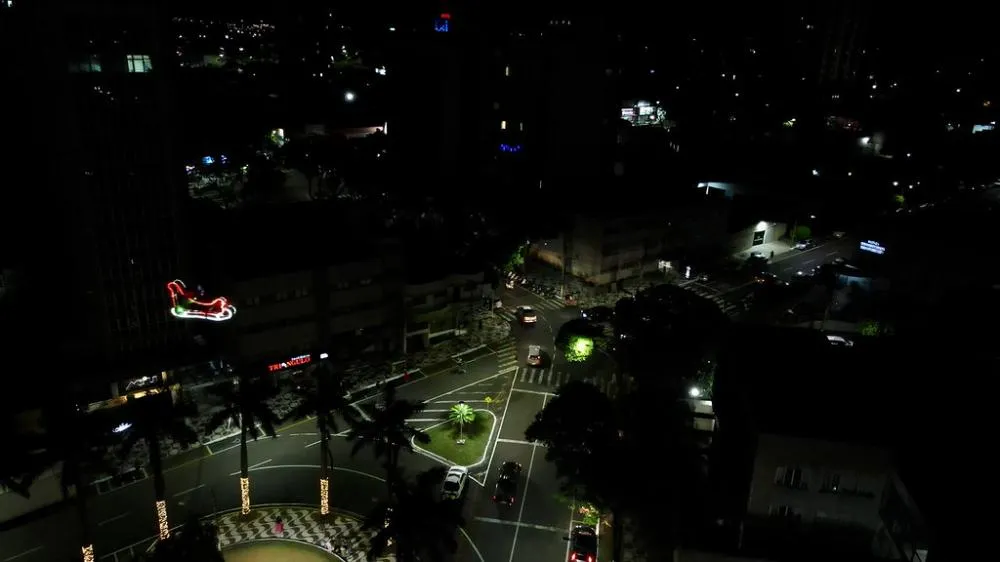O grande público que se reuniu para a esperada chegada do Papai Noel, abrindo a programação natalina em Umuarama, foi surpreendido com o sobrevoo do trenó do bom velhinho sobre a Praça Hênio Romagnolli, na noite da quinta-feira, 11. Com auxílio de um drone de grande porte, um trenó cenográfico todo iluminado e colorido fez várias passagens aéreas pela praça, enquanto o bom velhinho ‘procurava’ um local para pousar.