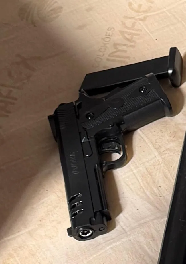 No local indicado, os agentes localizaram um simulacro de arma de fogo, de cor preta, que foi apreendido e encaminhado à Delegacia da Mulher para as providências cabíveis. Embora não se trate de uma arma real, o objeto pode ter sido utilizado para causar temor e constrangimento à vítima, o que reforça os indícios dos crimes investigados.