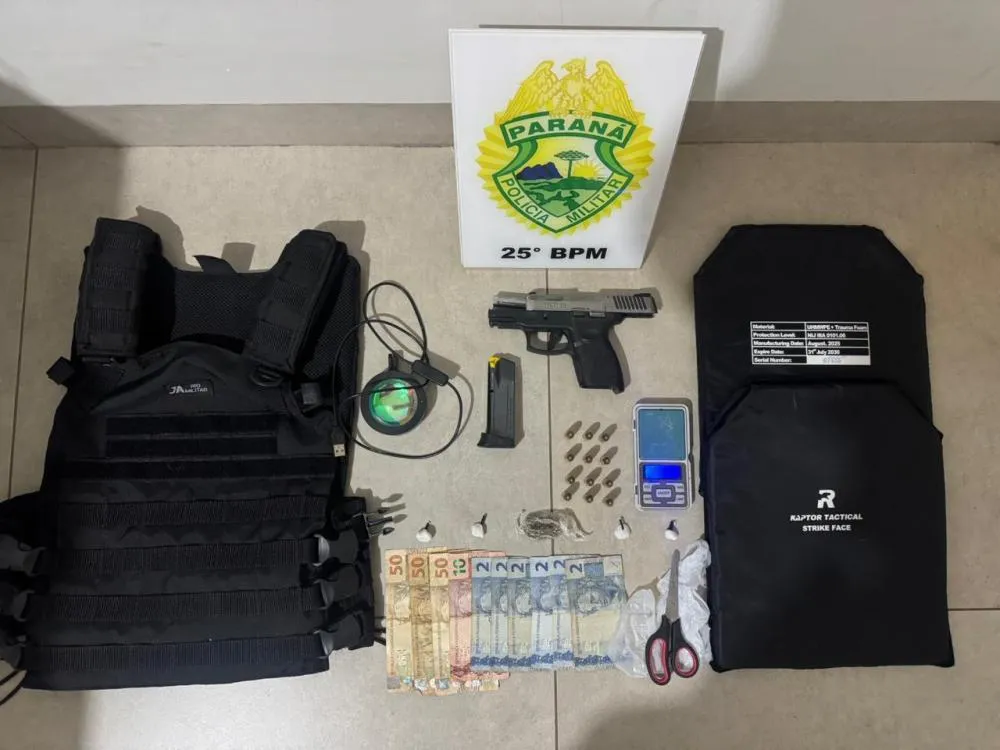 No local, os policiais apreenderam uma pistola Taurus G2c calibre 9mm com munições, substância análoga à cocaína (quantidade a ser contabilizada), dinheiro em espécie e um colete balístico. A Polícia Militar destacou que a ação faz parte do enfrentamento direto ao crime organizado e ao cumprimento de ordens judiciais na região.