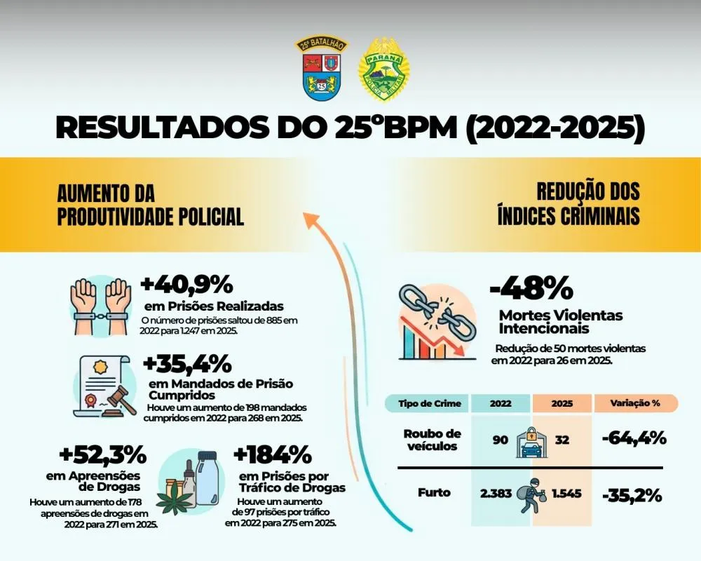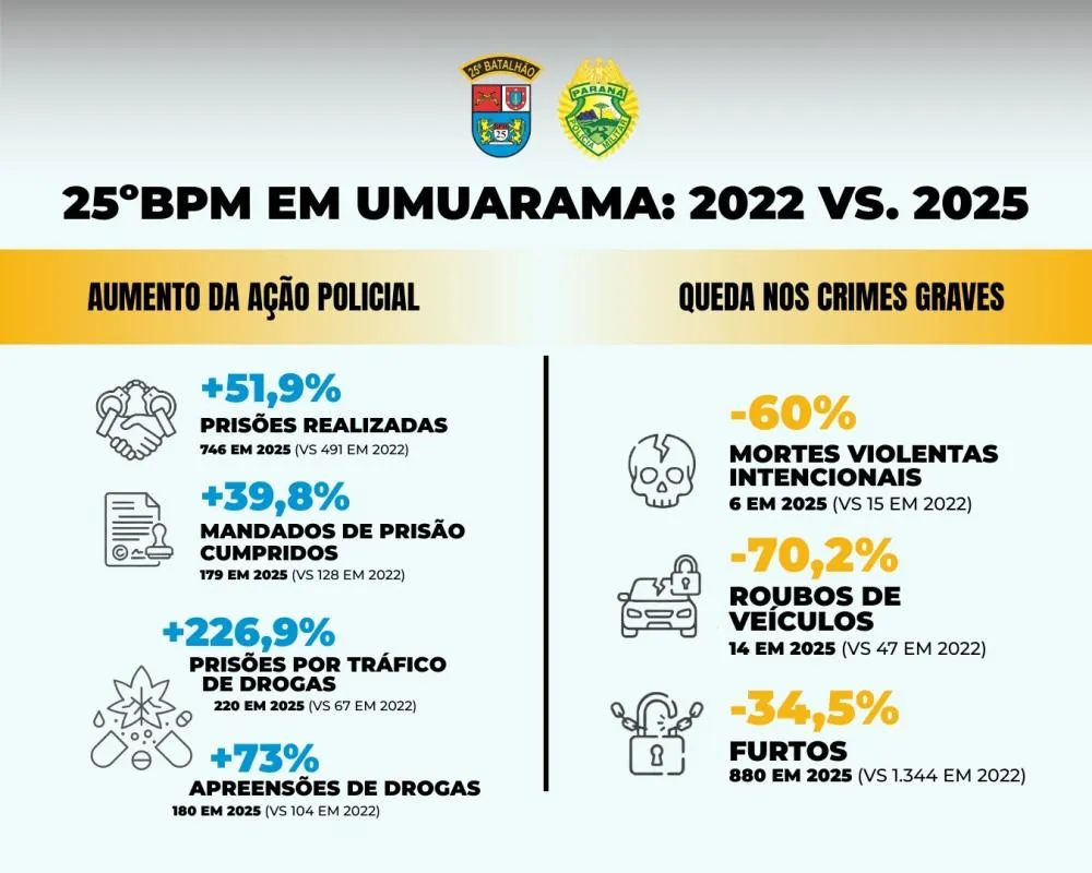 O 25º Batalhão de Polícia Militar (25º BPM), subordinado ao 3º Comando Regional da Polícia Militar (3º CRPM), divulgou o balanço do desempenho operacional referente ao ano de 2025, com base em um comparativo com os dados de 2022. Os números revelam um avanço significativo na produtividade policial e, ao mesmo tempo, uma expressiva redução dos principais indicadores de criminalidade em Umuarama e nos municípios que integram a área de atuação do batalhão.