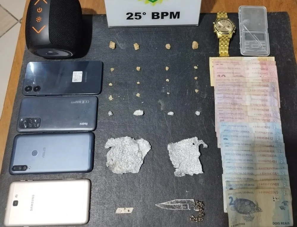 Após período de observação, os policiais confirmaram a prática criminosa e realizaram a abordagem simultânea de seis pessoas, com idades entre 23 e 58 anos. Durante a operação, foram apreendidas 6,6 gramas de crack que, após fracionadas, poderiam resultar em aproximadamente 70 pedras prontas para a comercialização, caracterizando o tráfico. Também foram encontrados uma balança de precisão, lâminas usadas no fracionamento da droga, papel alumínio para embalagem, R$ 126 em dinheiro trocado, quatro telefones celulares e uma caixa de som portátil. Um relógio localizado no local também levantou suspeita de possível origem ilícita.