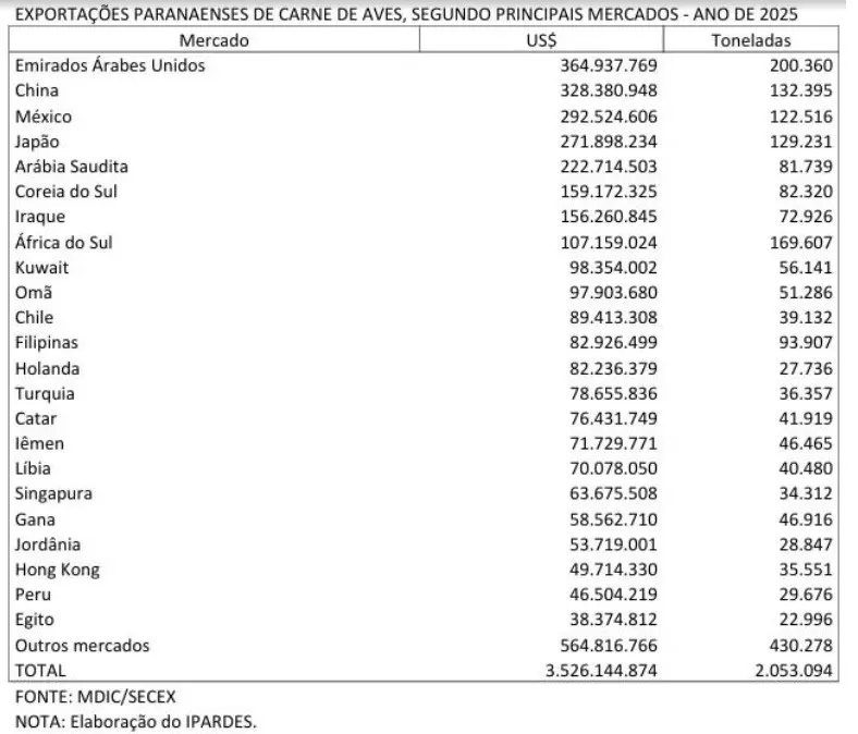 Além de ocupar a liderança no ranking nacional da produção de carne de aves, com 1,7 bilhão de animais processados até o terceiro trimestre de 2025, o Estado do Paraná também encabeça a lista dos maiores exportadores, destinando, ao mercado internacional, 2,05 milhões de toneladas do produto no ano passado, o que gerou receitas da ordem de US$ 3,53 bilhões.